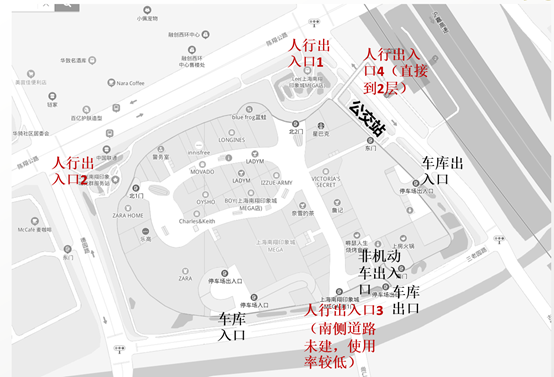以南翔印象城為例,1層人行出入口有三個,1號是主入口,服務于東側留云湖周邊客群,南面南翔老鎮(zhèn)區(qū)居民;2號是次入口,承接嘉閔高架來向的嘉定新城區(qū),江橋鎮(zhèn)區(qū)客群。