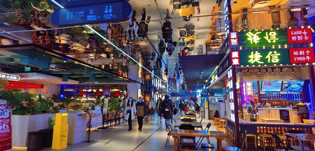 此外還將本土文化元素注入了整體空間中,例如將店鋪立面變形,以現(xiàn)代化的手法和材料,打造出新式復古建筑和地面以及金屬與霓虹結(jié)合充滿科技感的天花板。