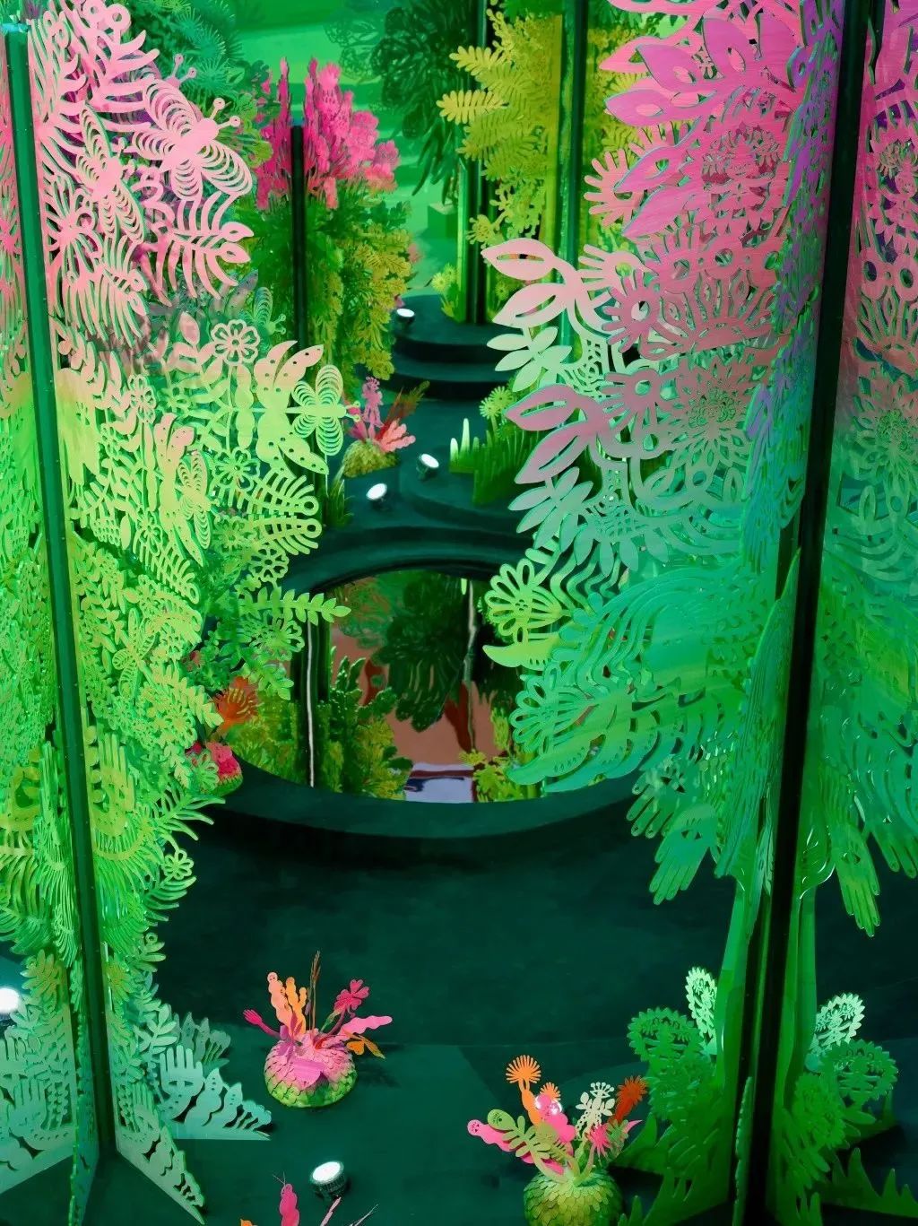 不同于傳統(tǒng)的剪紙依靠對折、裁剪收獲對稱圖案,其用新的視角和方式脫離基礎(chǔ)工藝,用1200+張環(huán)保紙手工著色,加入概念、科技等手法完成鏤空剪紙,使每張紙呈現(xiàn)的色彩紋理都大為不同,用強(qiáng)烈的視覺沖擊為剪紙藝術(shù)帶來新的詮釋。鮮明自由的花園將人們從繁瑣生活中抽離,在沉浸式的展覽中得到藝術(shù)、文化的熏陶,得到環(huán)保與自然的啟發(fā)。
