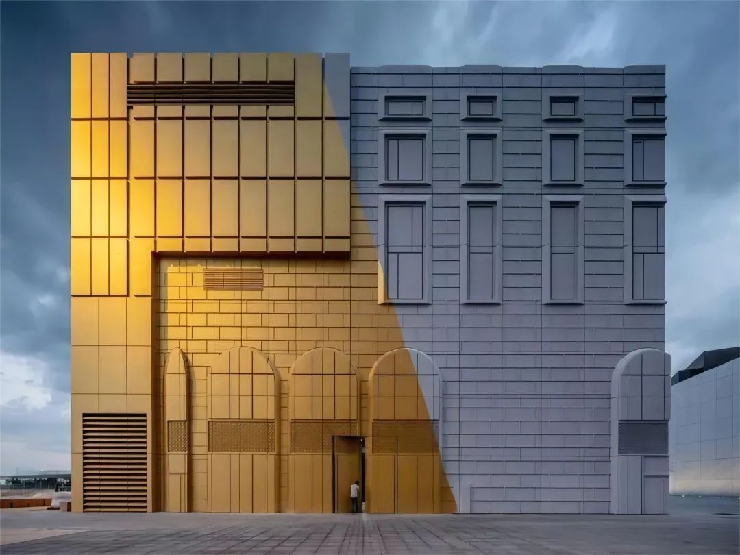 項目的商業(yè)綜合體“沙盒”與俱樂部具有統(tǒng)一的語言,在建筑周圍回響,成為整體的一部分。俱樂部的入口廣場和外墻有一個巨大的金色光圈投影,突出了入口的位置,金色的光圈與漆黑的室內(nèi)空間形成鮮明對比,又很融洽的融合在一起,形成了具有流動性的美感。