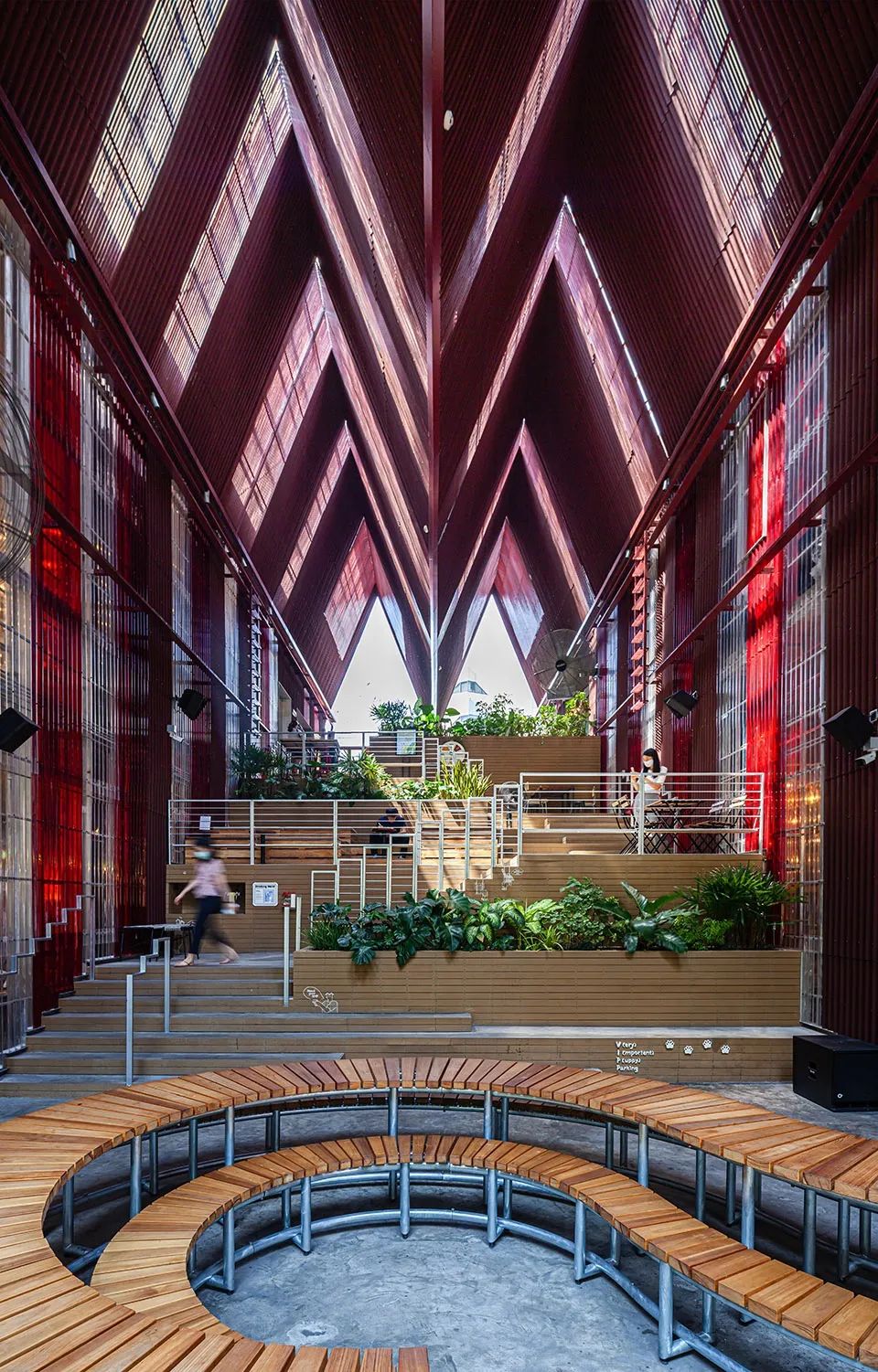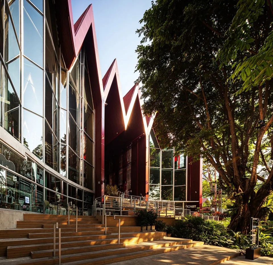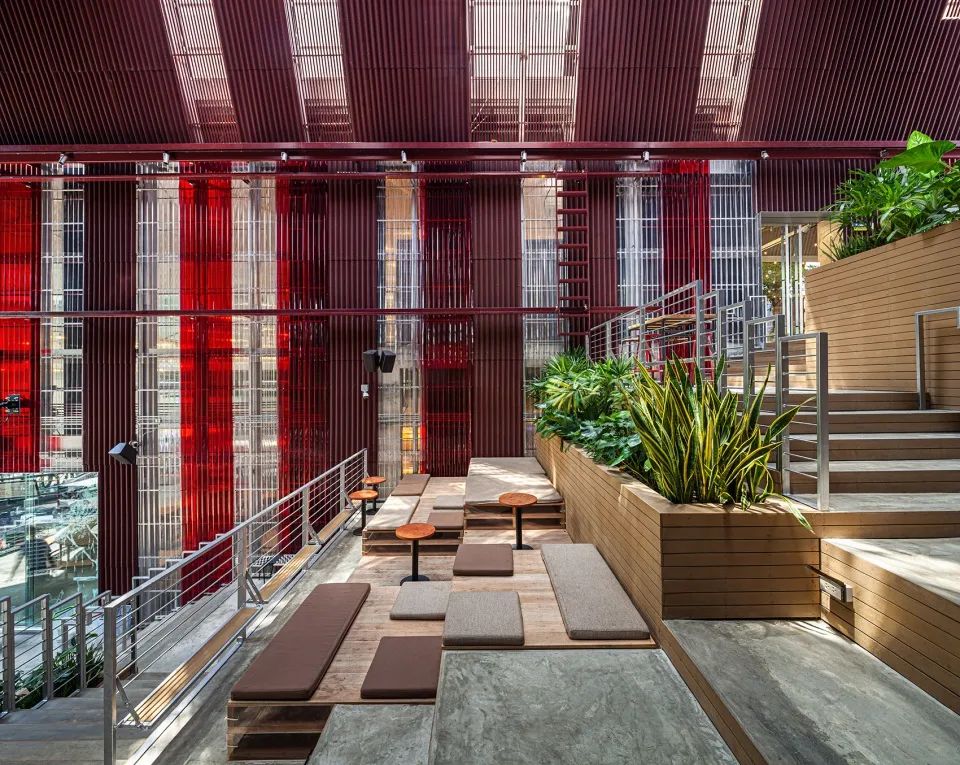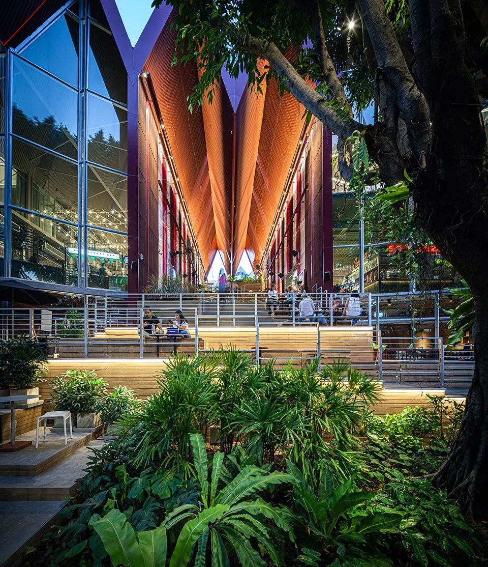 區(qū)域中涵蓋大臺(tái)階、露臺(tái)、座椅和綠植,以及為整個(gè)空間帶來“層流”(持續(xù)且低速的空氣流通)大型的工業(yè)風(fēng)扇,給人們帶來輕松舒適的社交及餐飲空間,并充分適應(yīng)了曼谷的熱帶氣候。