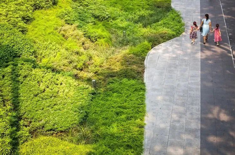 在對(duì)Central World購物中心外側(cè)的人行道經(jīng)過改造后,其變得更加寬敞明亮:人行道上鋪有青石,中間有一條綠色草坪,植物繁茂,景色宜人,為游客提供了一個(gè)舒適的休息空間。