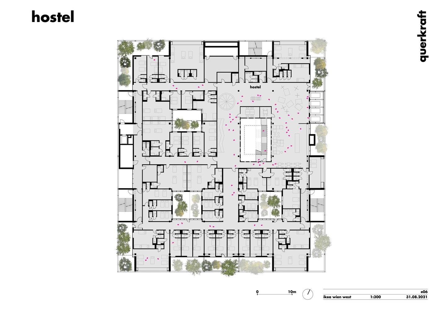 通過(guò)開(kāi)放的平面圖混合各種功能。預(yù)制的鋼筋混凝土柱矗立在約10×10米的網(wǎng)格上,使空間的使用和設(shè)計(jì)具有靈活性。可以很容易地進(jìn)行調(diào)整以滿足不斷變化的需求,這一點(diǎn)已經(jīng)變得很明顯。宜家的零售店占據(jù)了較低的樓層,而擁有345個(gè)床位的Jo&Joe旅館則位于最上面的兩層。這種組合創(chuàng)造了一個(gè)每周7天、每天24小時(shí)都有活力的建筑。