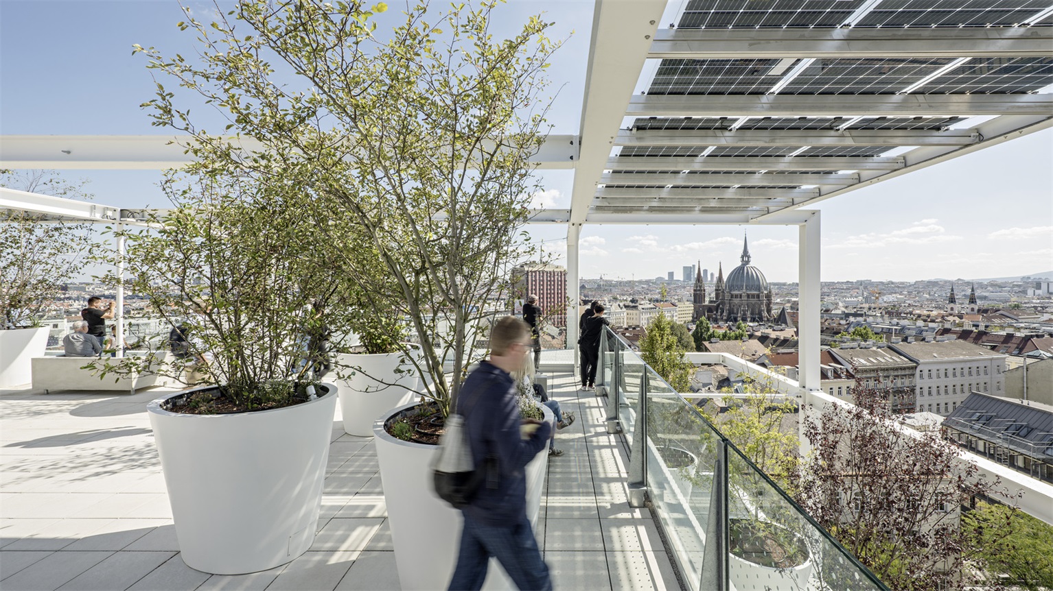 客戶提出了目標(biāo):”我們想成為一個(gè)好鄰居。”實(shí)現(xiàn)這一目標(biāo)的方法體現(xiàn)在建筑上,它代表了一種附加值,也代表了周?chē)h(huán)境。屋頂平臺(tái)向公眾開(kāi)放,提供了喝咖啡、放松和欣賞城市風(fēng)景的地方,所有外墻都有大量的綠色植物——這些都是作為“好鄰居“的設(shè)計(jì)元素。