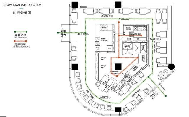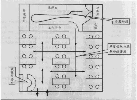 動線的設(shè)計可以說是餐廳經(jīng)營的一種手段,它分顧客動線和服務(wù)動線,顧客動線就是消費者行為的點,服務(wù)動線就包含了服務(wù)員和后廚的人員所移動的點。