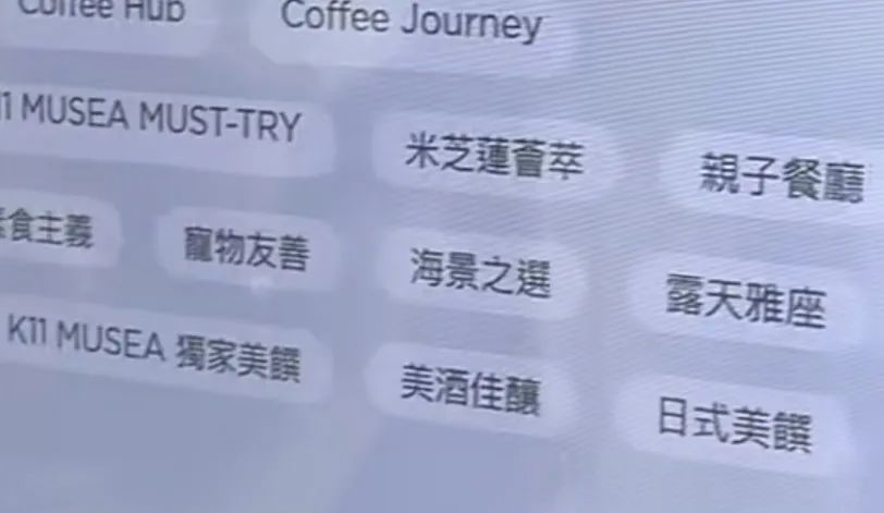 另一方面,顧名思義,導(dǎo)視系統(tǒng)主要用于指引消費(fèi)者尋找其想要抵達(dá)的具體空間、門(mén)店的方向、路徑,但不少購(gòu)物中心往往忽視了一點(diǎn),即可以借消費(fèi)者搜索目的地或是瀏覽布局的過(guò)程中,迅速為其梳理場(chǎng)內(nèi)的多元化場(chǎng)景主題,讓消費(fèi)者無(wú)形中產(chǎn)生探索欲。較為典型的案例,則有香港K11 MUSEA在電子導(dǎo)視系統(tǒng)中設(shè)置的基于不同場(chǎng)景、圈層的標(biāo)簽,如亞洲美食、中式美食、親子餐廳、毛孩最?lèi)?ài)等,在其導(dǎo)視中,甚至細(xì)分到將用餐場(chǎng)景如帶有"海景之選"、"露天雅座"的門(mén)店進(jìn)行歸納,由此形成了很好的場(chǎng)景化指引和導(dǎo)流。與此同時(shí),作為主打藝術(shù)的購(gòu)物中心,在其導(dǎo)視系統(tǒng)中,消費(fèi)者也能夠迅速檢索到不同藝術(shù)畫(huà)作及裝置的樓層分布和場(chǎng)景預(yù)覽。