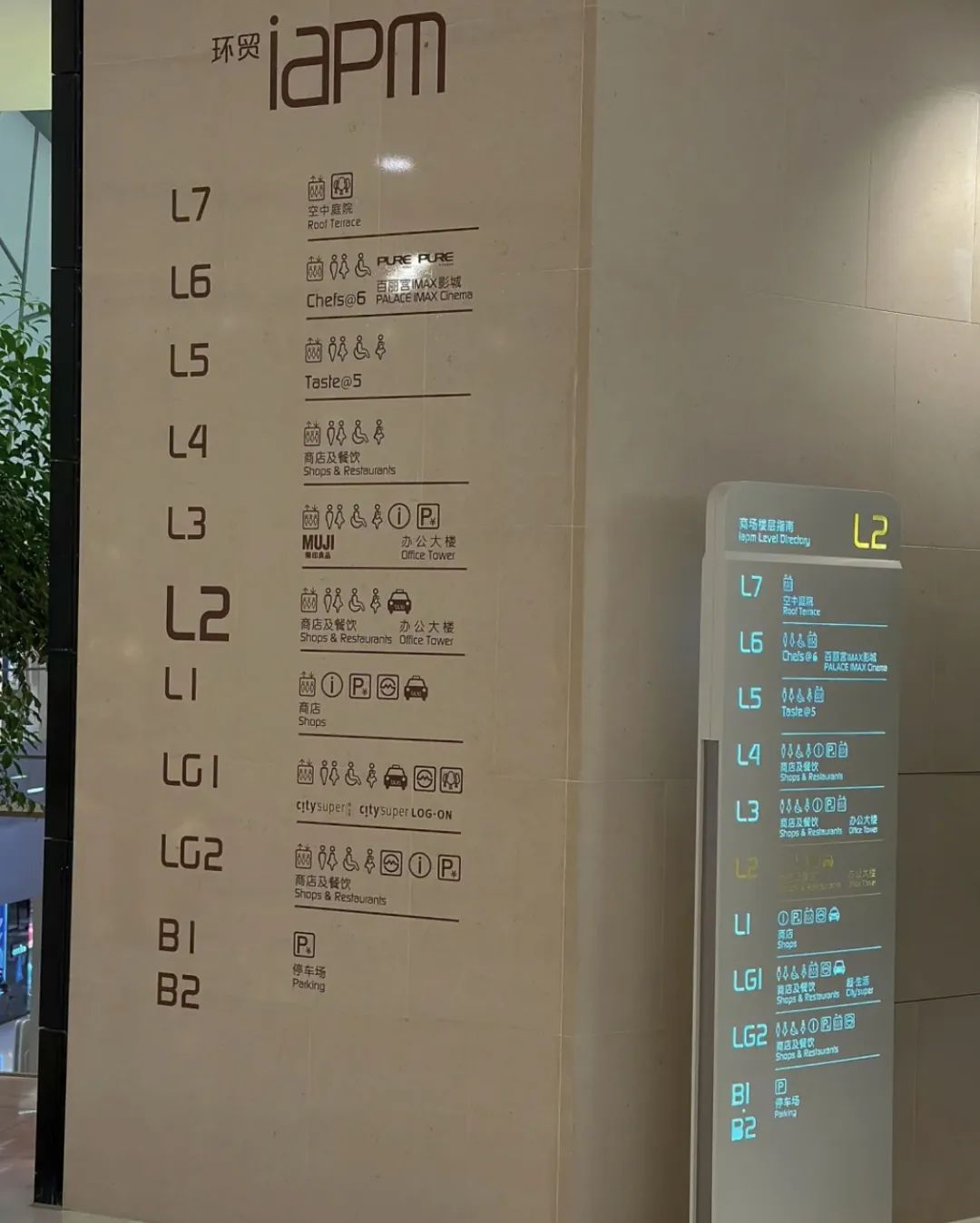 環(huán)貿(mào)·iapm商場(chǎng),在墻體及導(dǎo)視立牌上,商場(chǎng)功能空間的標(biāo)識(shí)整體大小大于消費(fèi)場(chǎng)所的指引,并簡(jiǎn)潔放大突出各樓層標(biāo)志性主力店,也是一種人性化的設(shè)計(jì)。
