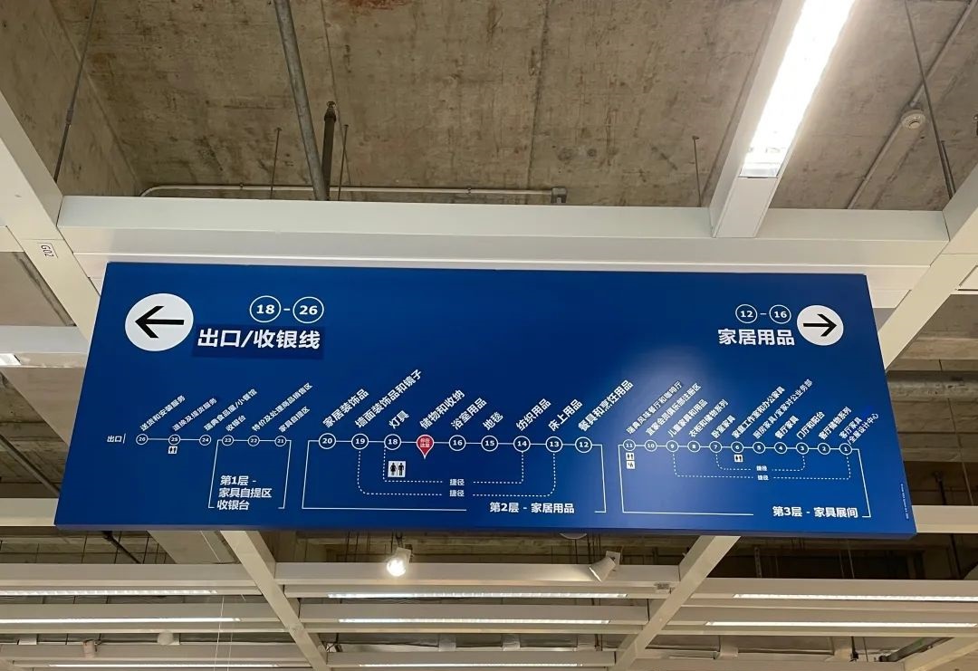 宜家賣場(chǎng)從外部到內(nèi)部都有清晰的指引信息。外部有碩大的“IKEA宜家家居”標(biāo)志和藍(lán)盒子造型能被顧客輕松發(fā)現(xiàn),停車場(chǎng)、賣場(chǎng)出入口的指引也相當(dāng)清晰。