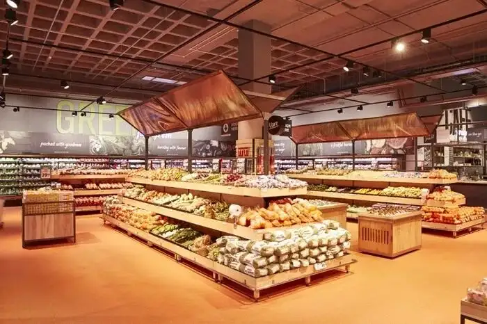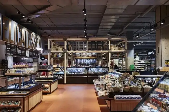 對于 TDC&Co 超市設計師們來說,首先第一步就是將所有商品從現(xiàn)有的位置上挪開 ,把它們從超市的前半部分,搬到商場的后半部分和左手邊上。其次,所有的服務區(qū)域被集中在右手邊,人們從這里可以通往商場后面。